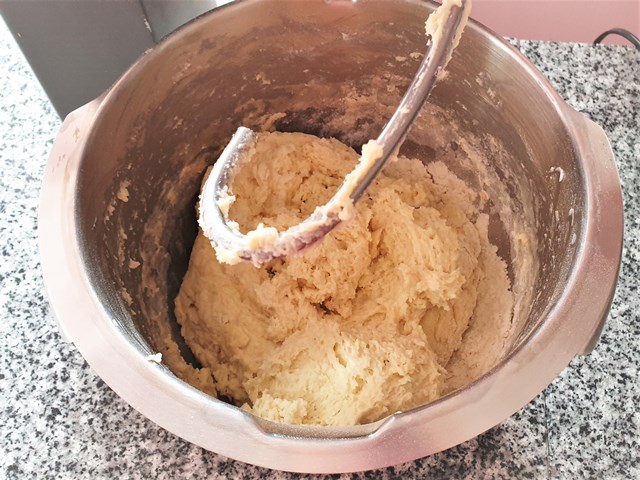 - Die Zutaten mit dem Knethaken verkneten. Der Teig ist zuerst noch recht klebrig, aber er sollte nicht zu lange mit der Rührmaschine bearbeitet werden.